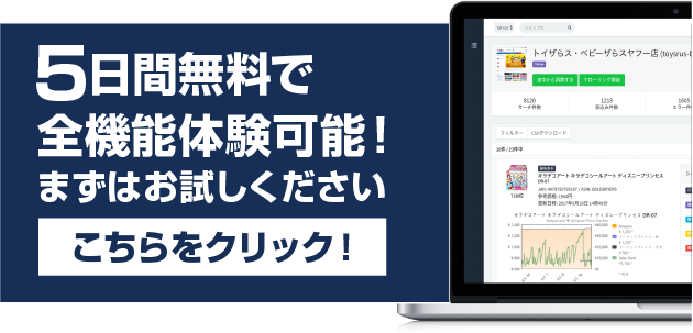 5日間無料と聞いたのでまずは試しに使ってみました。 リサーチしたいお店を入力すれば、勝手にセドリオンがお宝商品を探してくれるのは、今までの苦労はなんだったのかと思いました^^; 素晴らしいツールをありがとうございます!